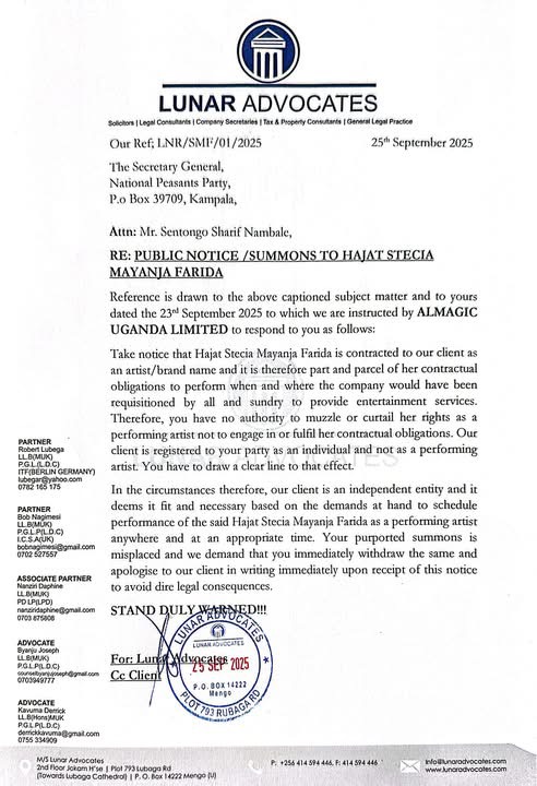 Ugandan events company ALMAGIC has hit back at the National People’s Party (NPP) after the party summoned singer Hajat Stecia Mayanja Faridah for performing at a rally of an NRM candidate while her own party also fields a presidential flag bearer.